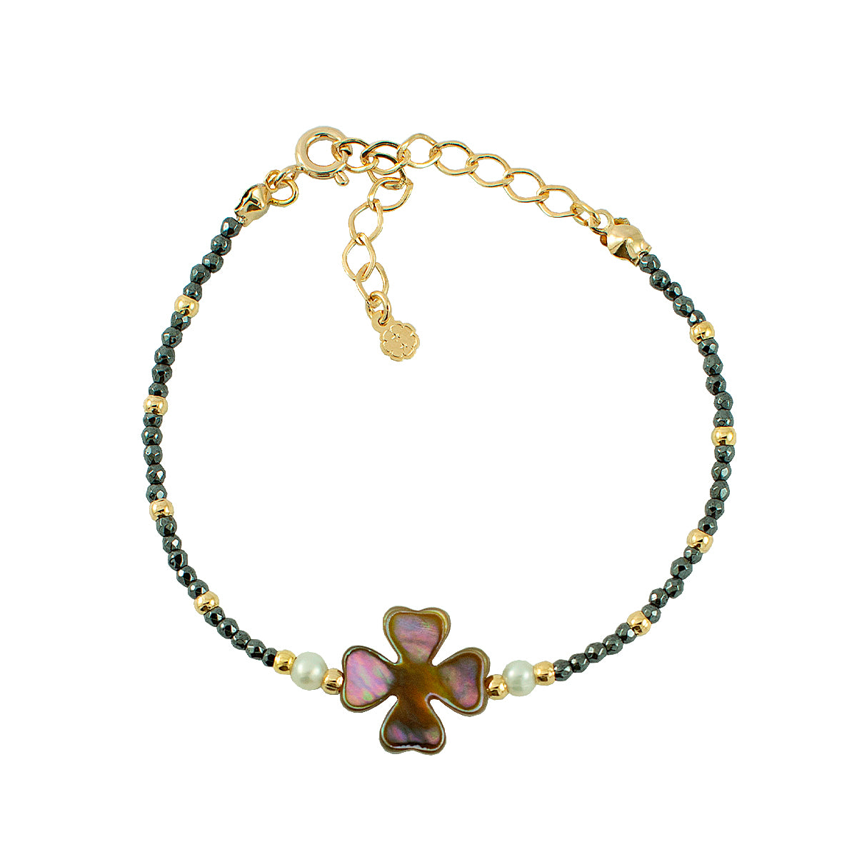 Pulseira banhada a ouro com hematitas, pérolas e trevo de abalone.