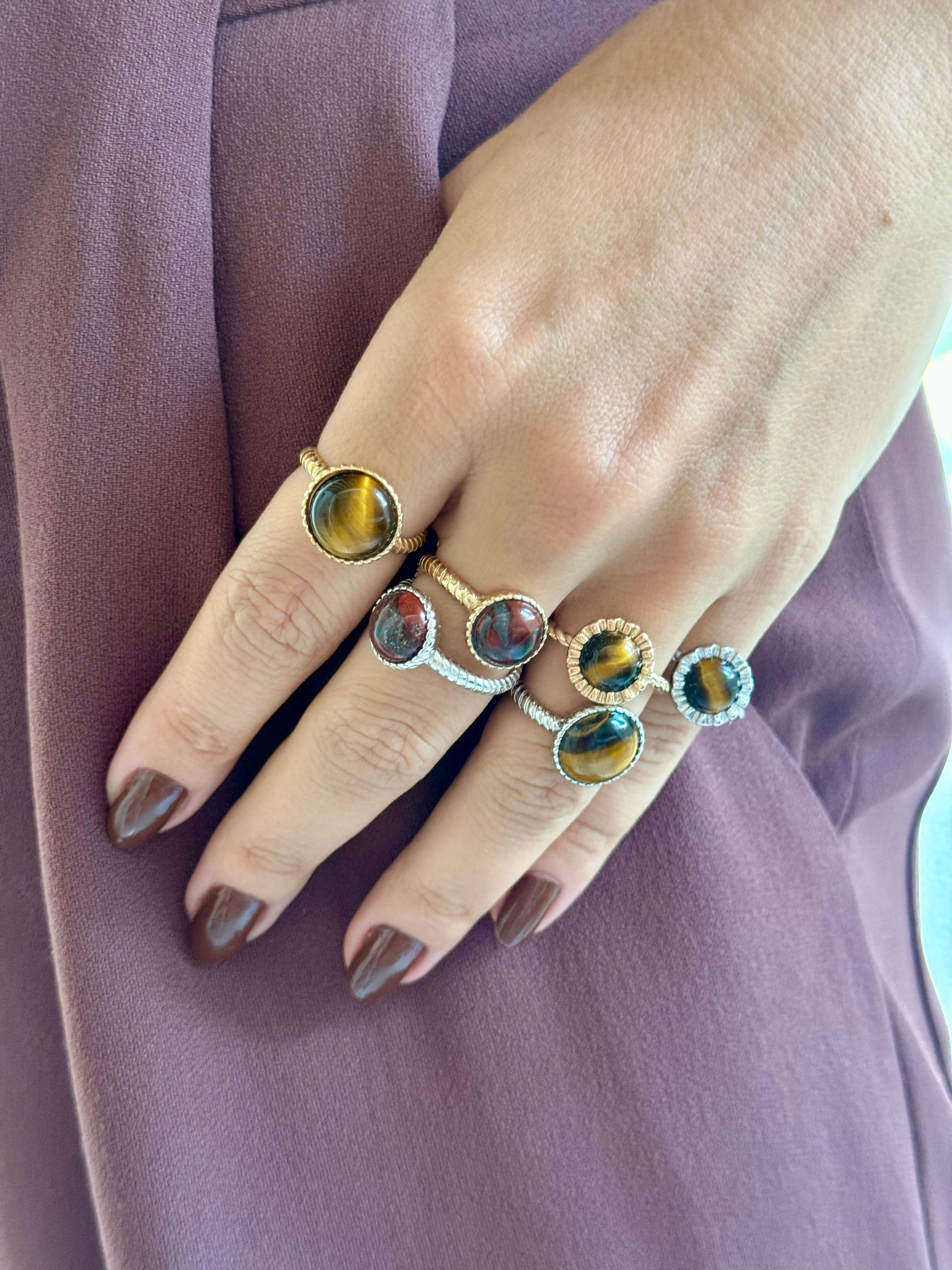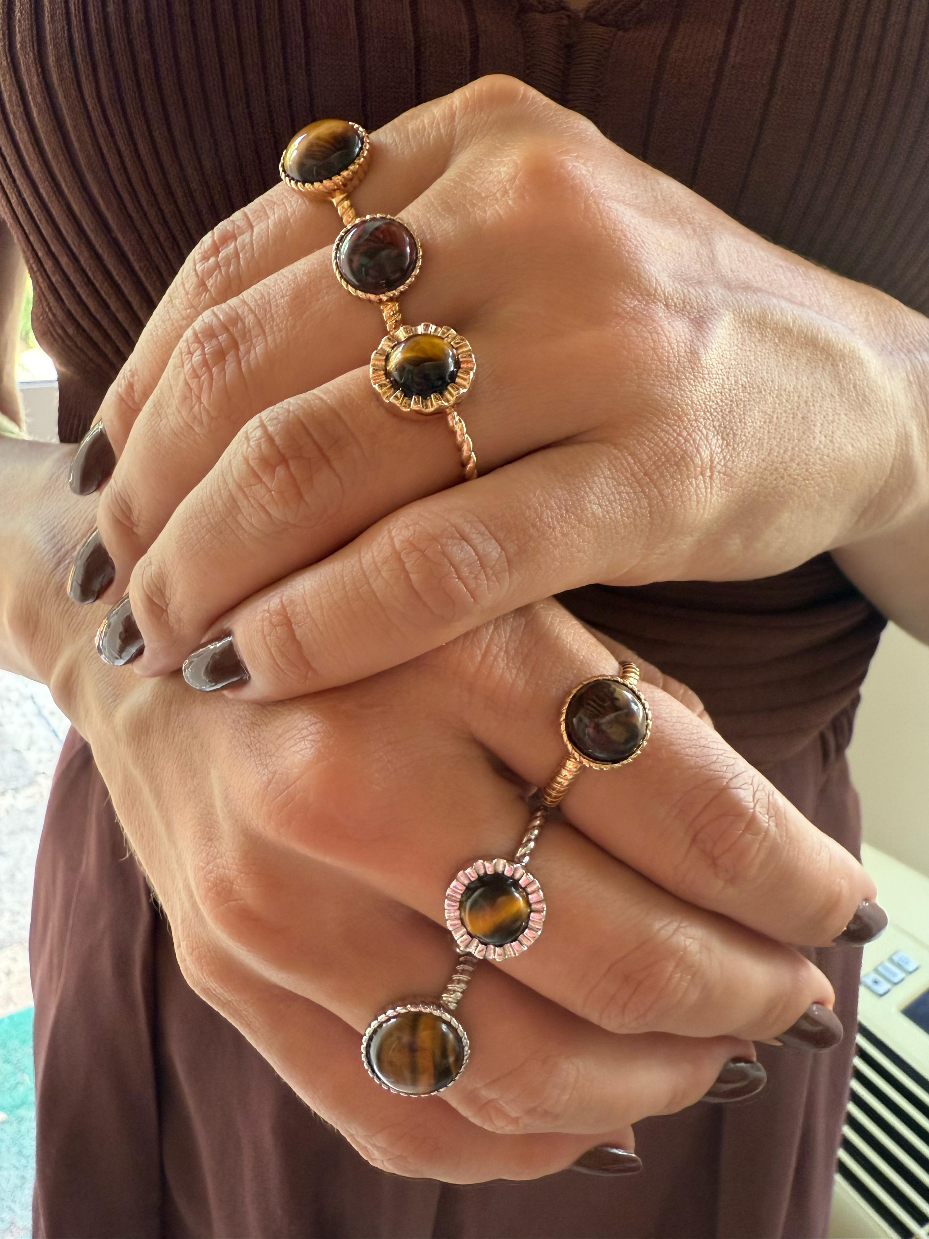 Anel regulável banhado a ródio com olho de tigre.Ajustável da numeração 12 ao 23. obs: Por se tratar de uma pedra natural, a cor pode variar da foto