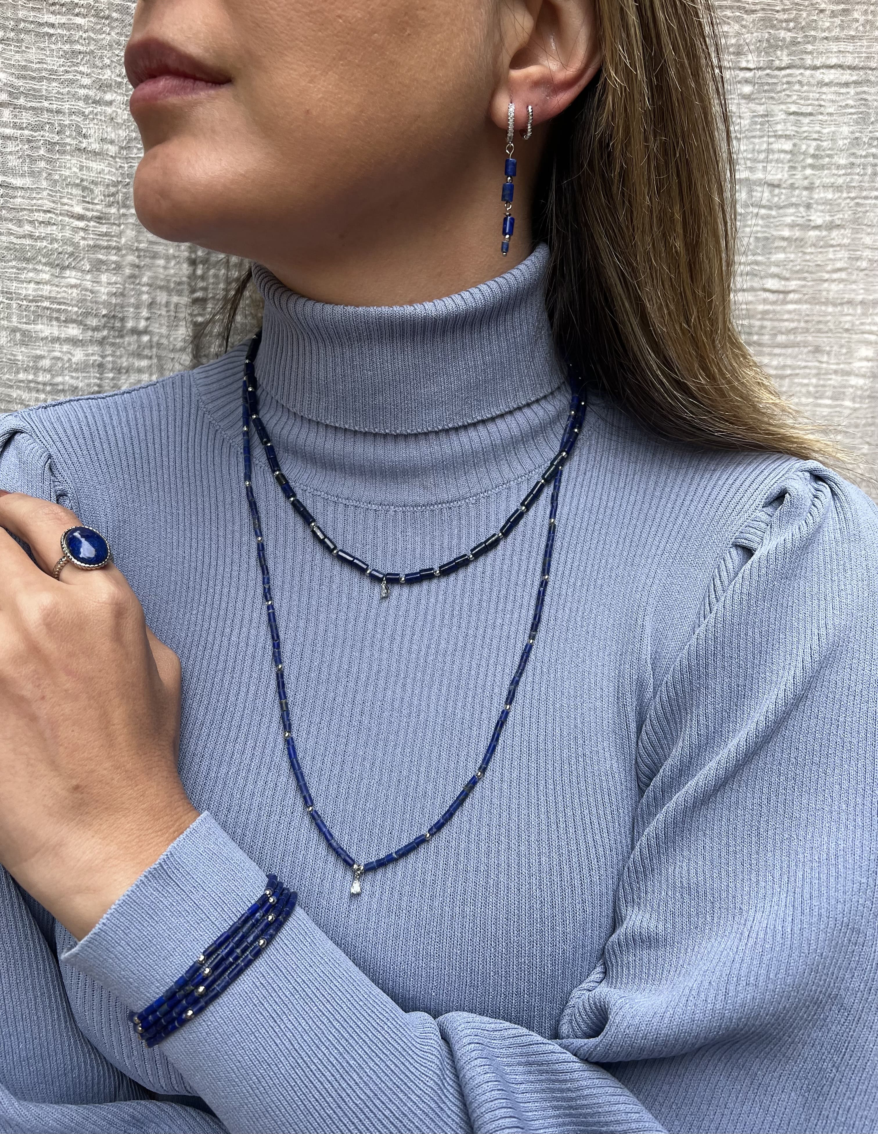 Colar banhado a ródio com lápis lázuli e zircônia.Tamanho: 65 cm + 5 cm de extensor.