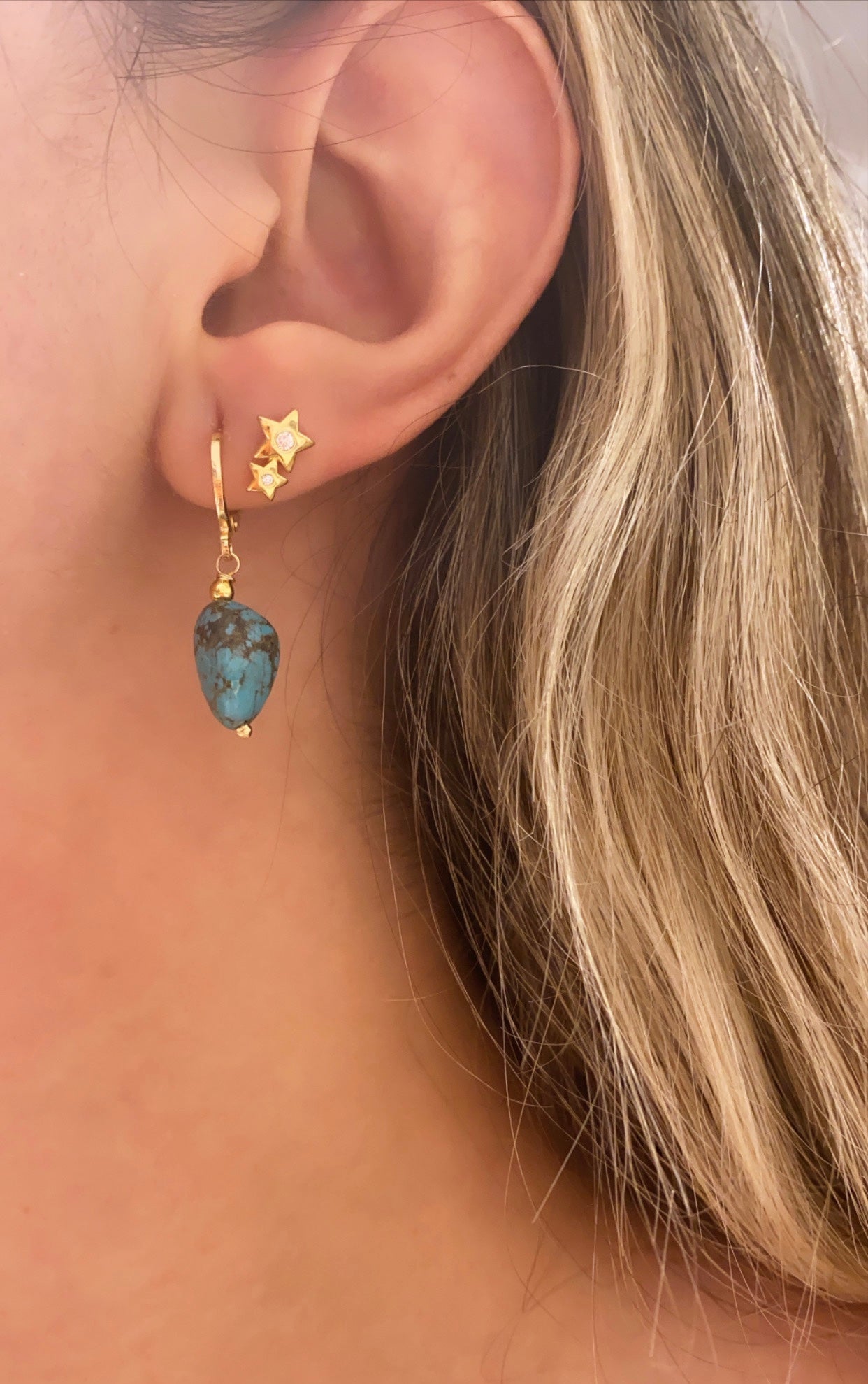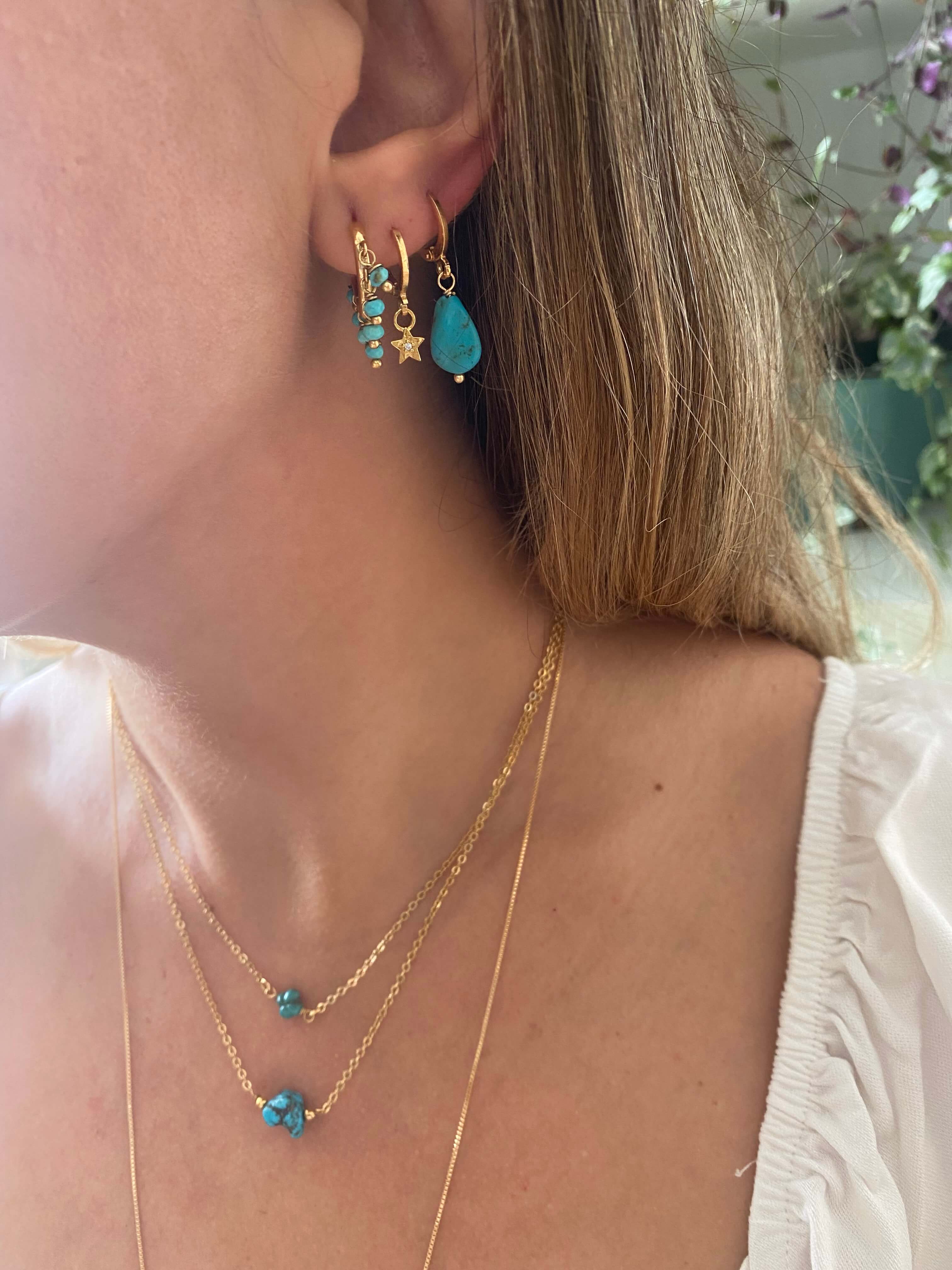 Argola banhada a ouro com turquesa.*Por se tratar de uma pedra natural a cor e o formato podem variar.Tamanho da argola: 1,2 cm de diâmetro.Tamanho do pingente: aproximadamente 1 cm de diâmetro.