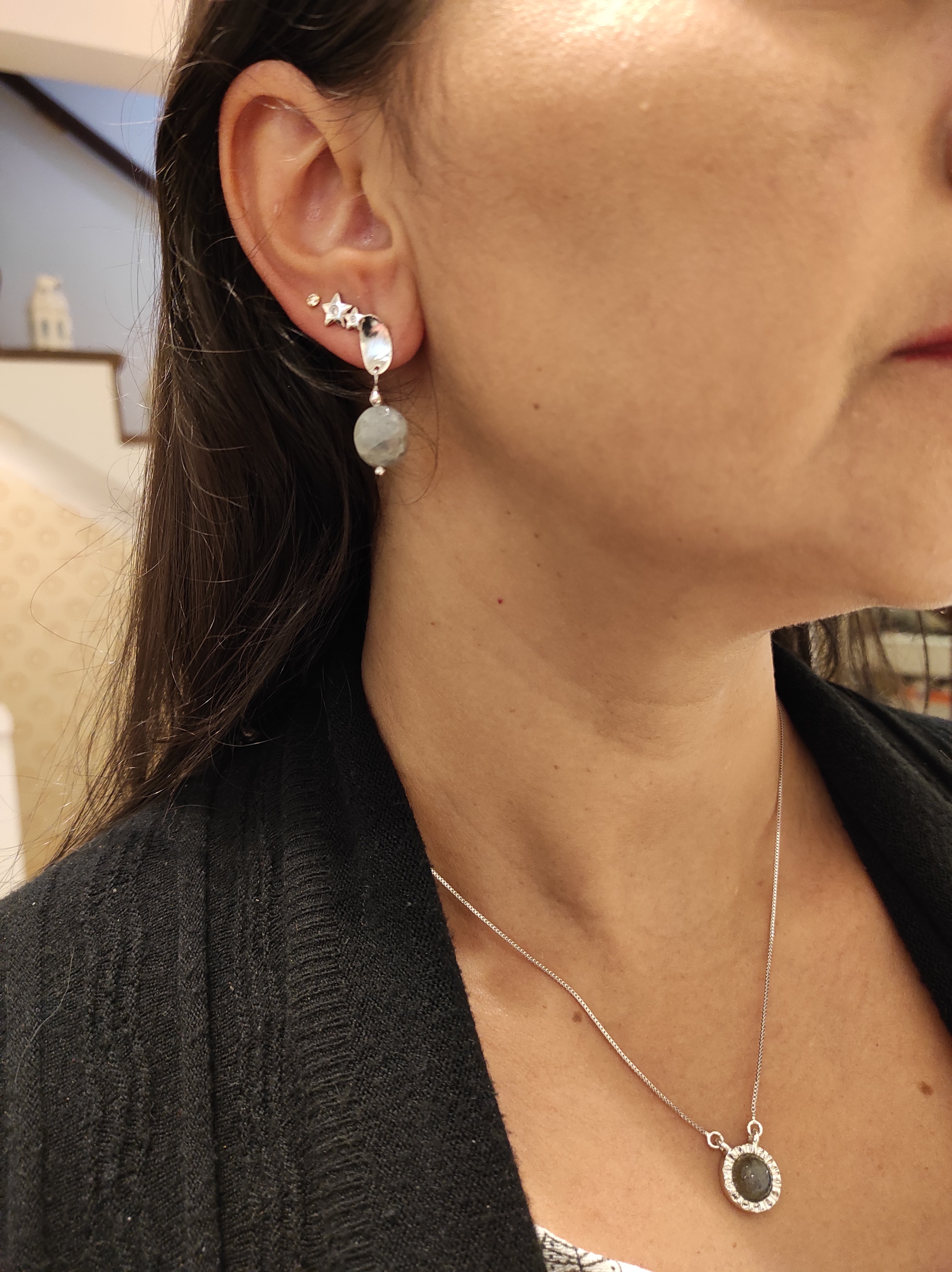 Brinco banhado a ródio com labradorita.Tamanho: 2,5 cm de comprimento.