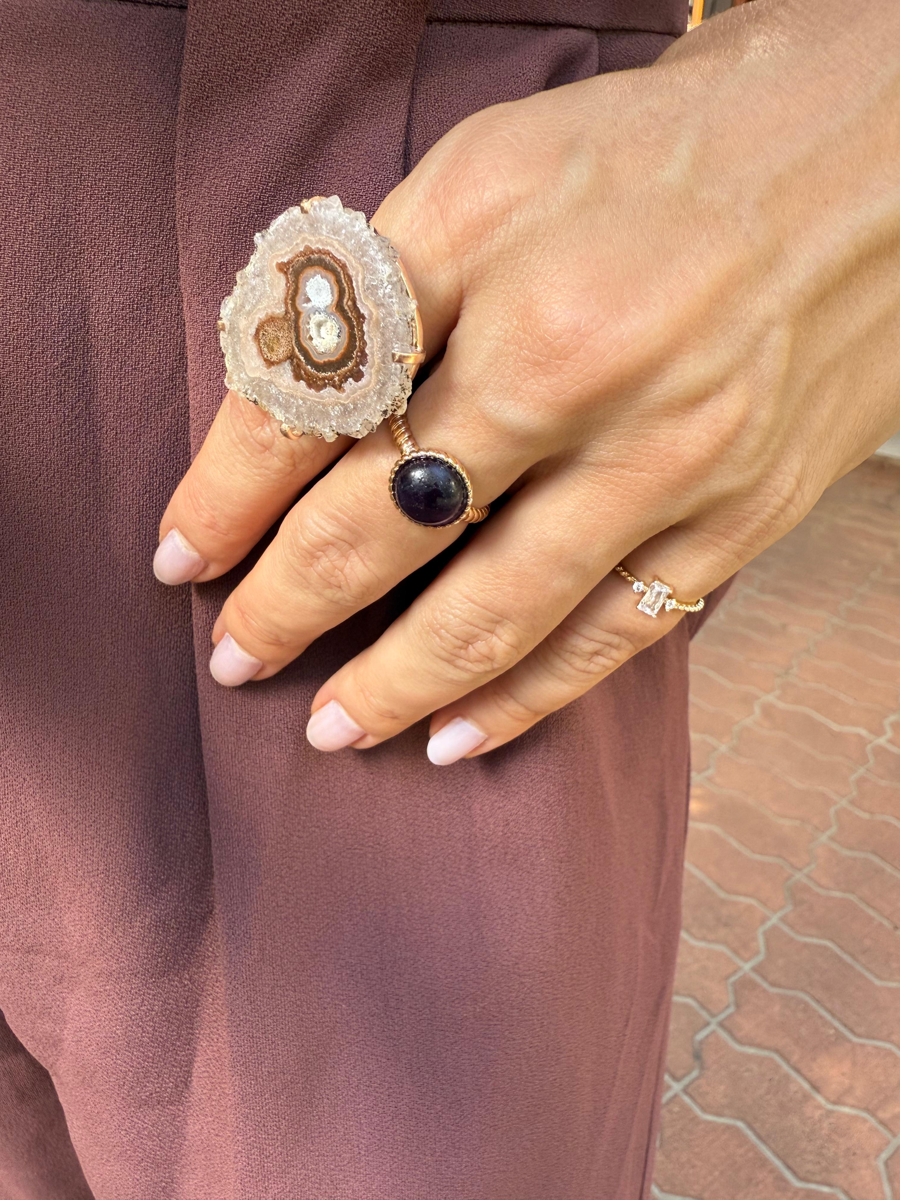 Anel regulável, confeccionado em prata e banhado a ouro, com pedra ágata. Tamanho aproximado da pedra: 3,0 cm.
