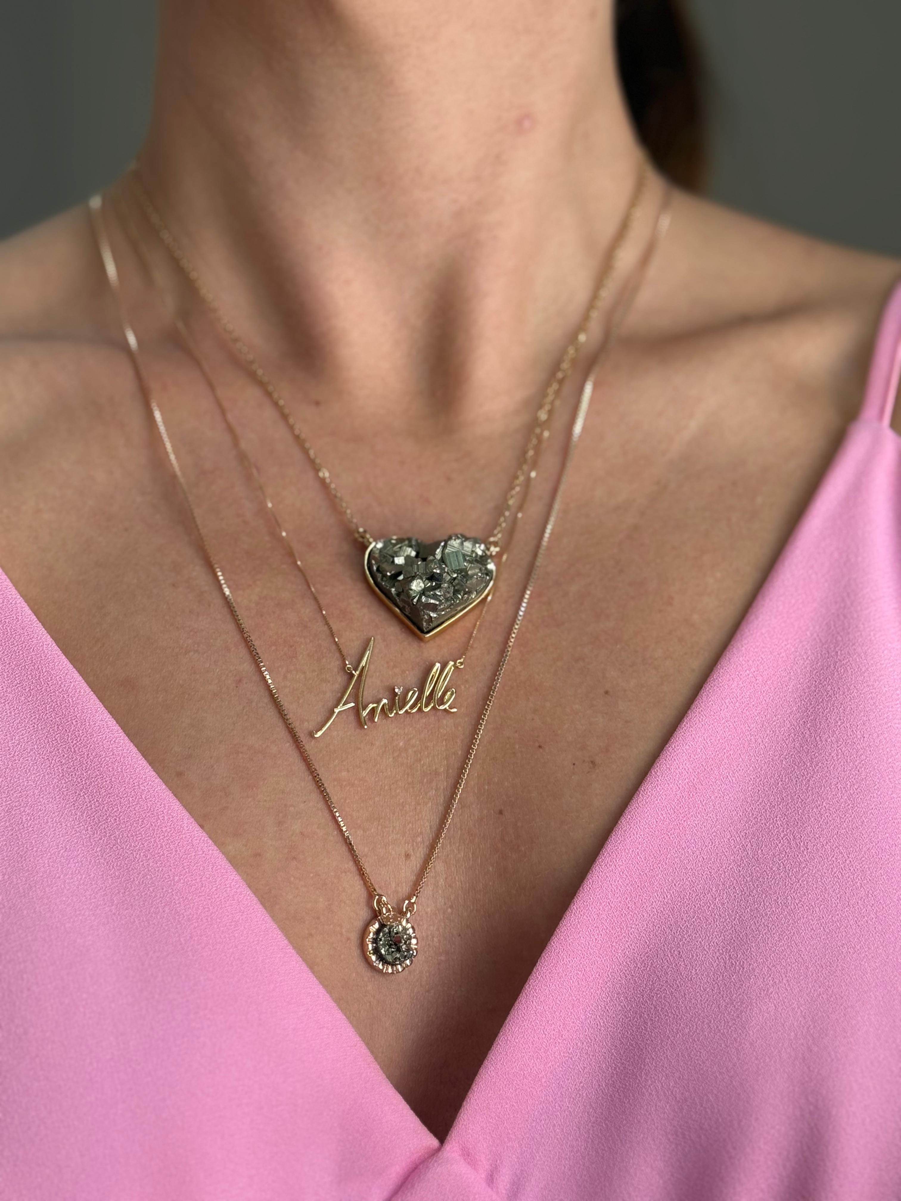 Colar com corrente banhada a ouro e pingente em prata com Pirita no formato de coração.