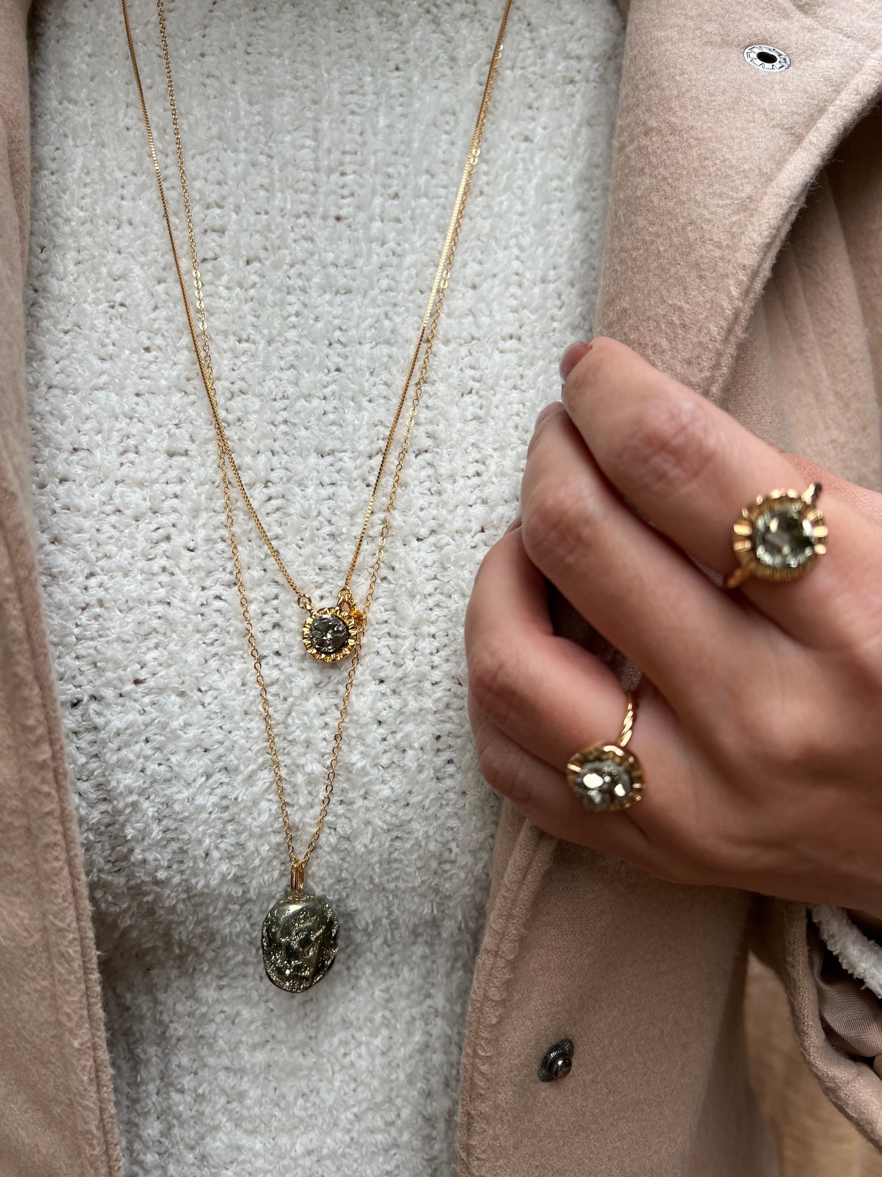 Colar banhado a ródio com pirita.Por se tratar de uma pedra natural, o tamanho e formato pode variar do da foto.Tamanho corrente: 80 cm sem extensor.